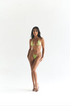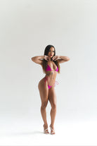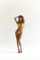 Designed with the modern woman in mind, with meticulous attention to detail, this bikini set apart is its thoughtful design with tie closures. The bikini top and bottoms feature ties, allowing women to customize the fit according to their preference and desired level of comfort. This feature not only adds a touch of versatility but also enables women to express their personal style through various tying techniques. From a luxurious blend of shiny nylon and spandex, this bikini set offers a comfortable and flattering fit. The fabric gently caresses the skin, providing a smooth and supportive feel while allowing freedom of movement. Its stretchy nature ensures a personalized fit that adapts to different body shapes and sizes